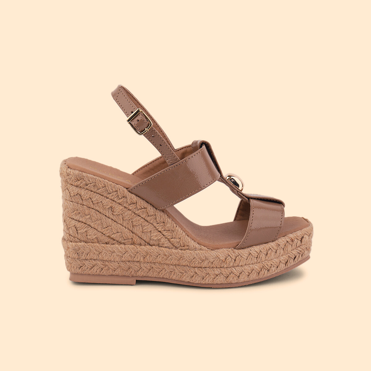 Combinando estilo y comodidad, nuestras sandalias de cuña con plataforma cuadrada de yute natural de 11 cm de alto, con corte abierto y detalles de herraje dorado perfecta para tus looks de verano.