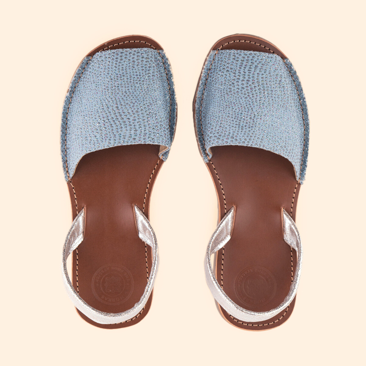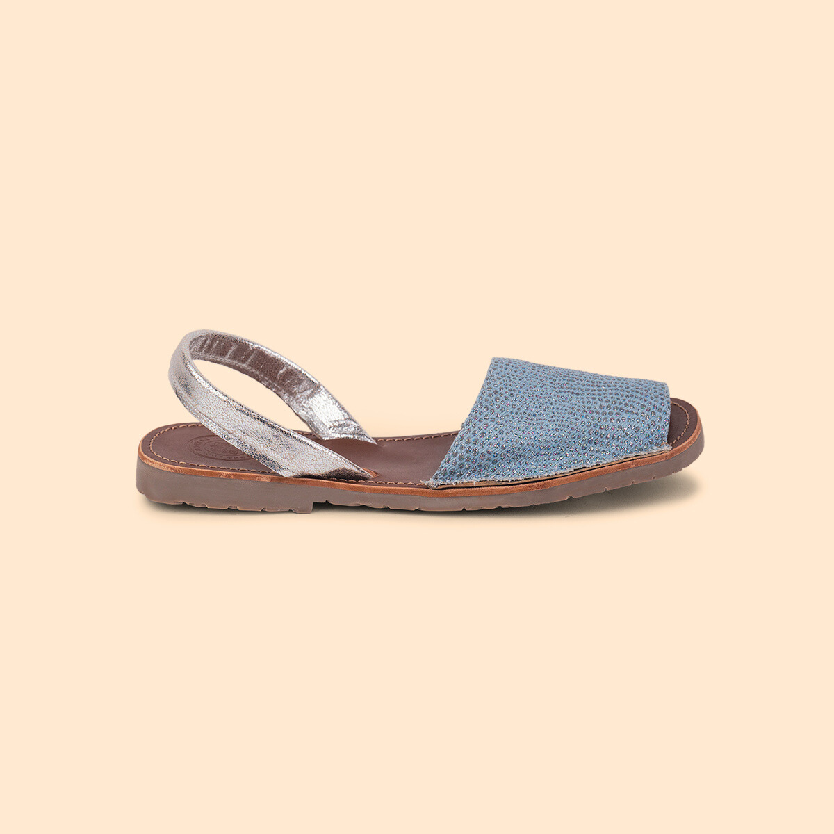 La sandalia para dama Avarca Clásica en piel es un modelo atemporal. Utilizamos las pieles más suaves para mayor confort, perfectas para la temporada en textil mezclilla con destellos plata con plantilla 100% cuero con protección anti-bacterial y anti-olor.