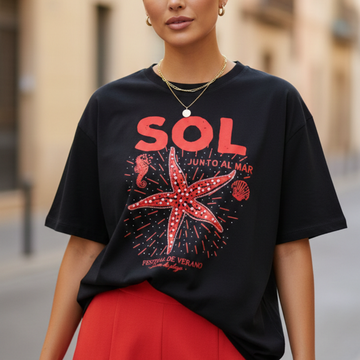 🌊 Playera oversized de algodón con estampado de conchas — Estilo relajado con esencia mediterránea